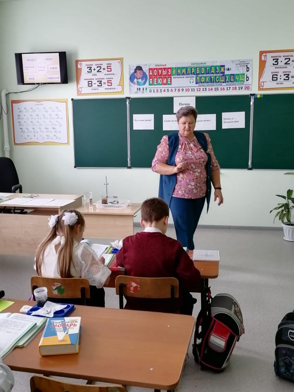 Урок окружающего мира по теме «Что такое почва? Практическая работа «Состав почвы»» в 3В классе, проведенный Солоповой Г.Н., продемонстрировал педагогам района развитие информационной грамотности младших школьников, как одной из форм функциональной грамотности. Это был урок открытия новых знаний в форме исследовательской работы. Галина Николаевна в ходе урока применяла различные формы, методы и приемы обучения: создание проблемной ситуации (в класс пришла посылка от научных сотрудников Центрально-Черноземного заповедника имени В.В. Алехина, в которой находилась картина (разрез почвы) и сопроводительное письмо с просьбой срочно изучить данный материал); работу с учебником, работу с толковым словарем; проведение исследовательской работы; работу в тетрадях с учебной основой; словесные беседы и опыты, проводимые непосредственно детьми и учителем. Учащиеся в ходе урока добывали информацию не только из учебника, но и из ранее подготовленного учителем раздаточного материала, из толковых словарей и из личных наблюдений. Дети на уроке выяснили: «Что такое почва?», «Состав почвы», «Кто обитает в почве?», «Свойства почвы», «Почвы в Курском крае». В результате проведения опытов и наблюдений дети делали выводы-ответы на поставленные вопросы, которые записывали в тетради. В конце урока обучающиеся поделились своими впечатлениями об уроке, сказав, что им было все очень интересно.