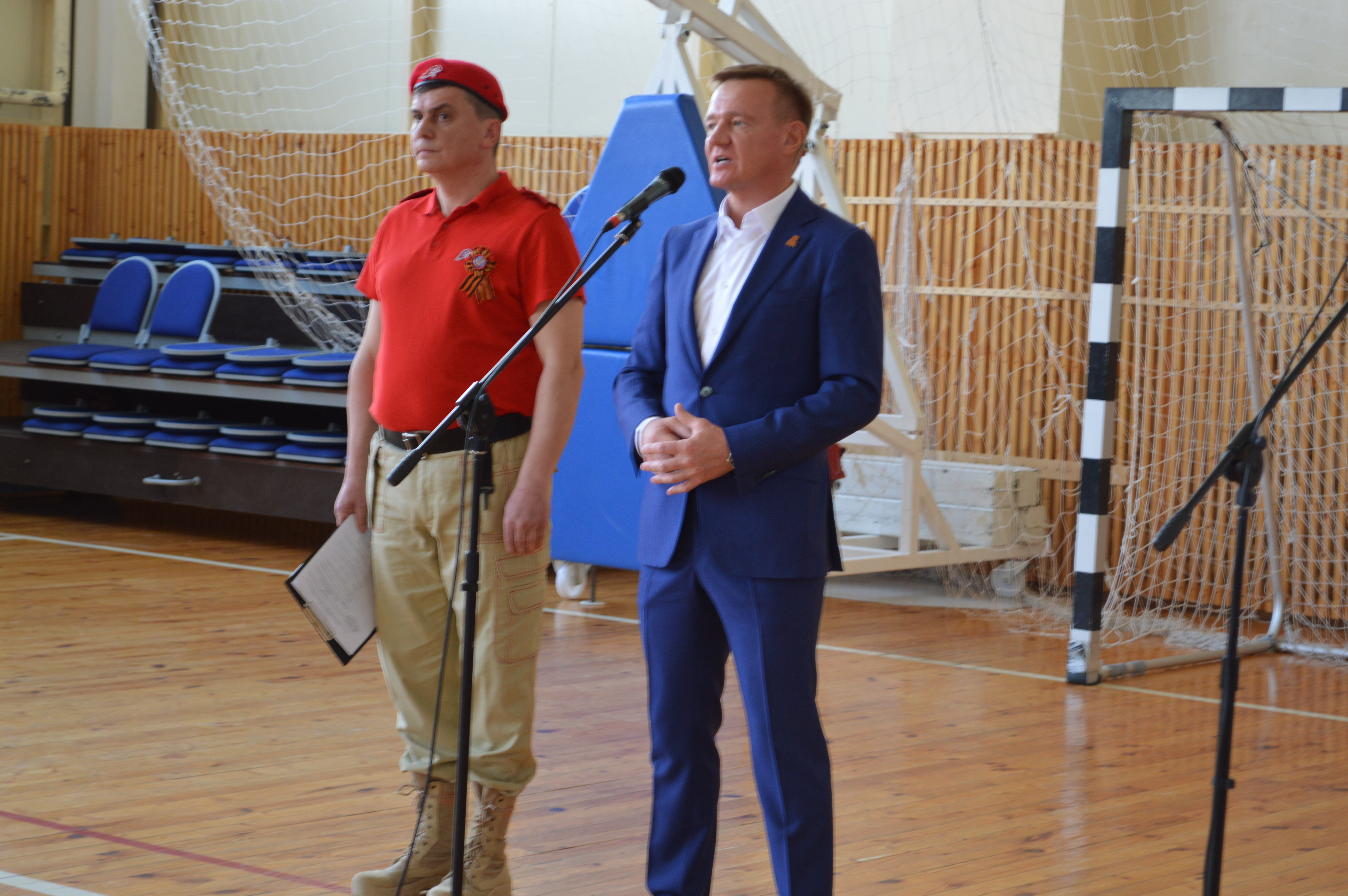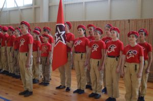 11.00. В зале Поныровской детско-юношеской спортивной школы плечом к плечу стоят 8 сводных юнармейских отрядов, знамена с именами Героев Советского Союза подняты, отряд барабанщиц победным маршем открывает смотр…